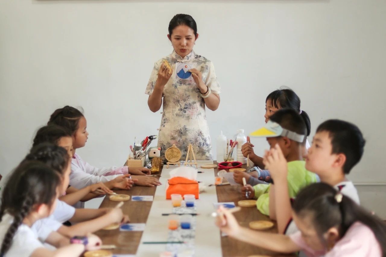 老師帶領(lǐng)小朋友現(xiàn)場體驗掐絲琺瑯和水拓團扇非遺技藝。孩子們認真地完成掐絲、點藍等步驟,用顏料勾勒出美麗的圖案,不僅體驗了手工制作的樂趣,也對非遺技藝有了更直觀的認識。
