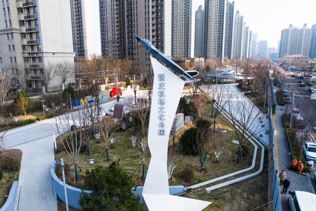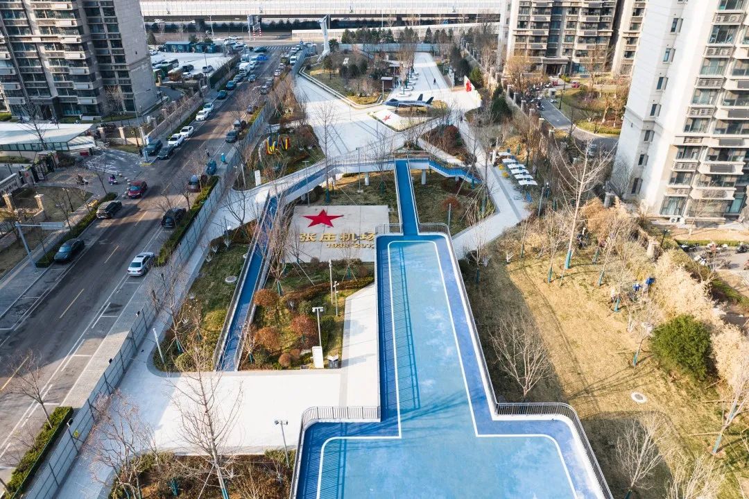 公園南區(qū)入口打造文化長廊,通過展示中國戰(zhàn)機(jī)發(fā)展史讓市民了解空軍文化;結(jié)合原有170米長水泥跑道,通過景觀手法進(jìn)行二次設(shè)計,融合機(jī)場跑道符號、導(dǎo)航等設(shè)施還原機(jī)場跑道場景,沿跑道科普展示曾在張莊機(jī)場服役的戰(zhàn)機(jī)模型,進(jìn)行航空科普、國防軍事及愛國主義教育。