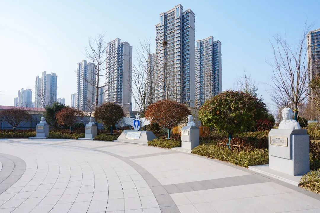 在公園南地塊紀(jì)念廣場,通過展示張莊機(jī)場原駐扎部隊6位空軍戰(zhàn)斗英雄的雕像和英雄事跡,以及“空中鐵拳精神”展示,傳承紅色基因。