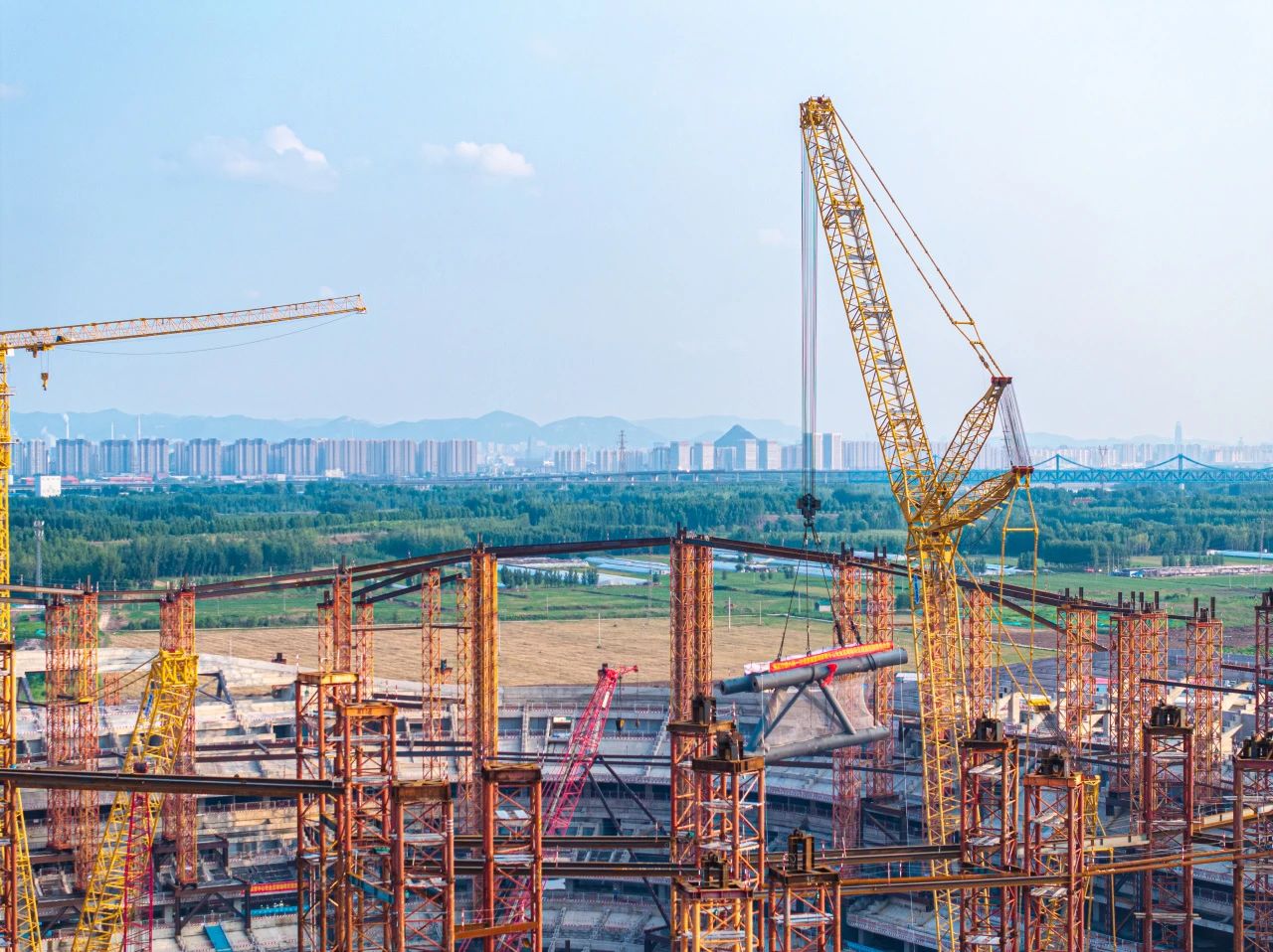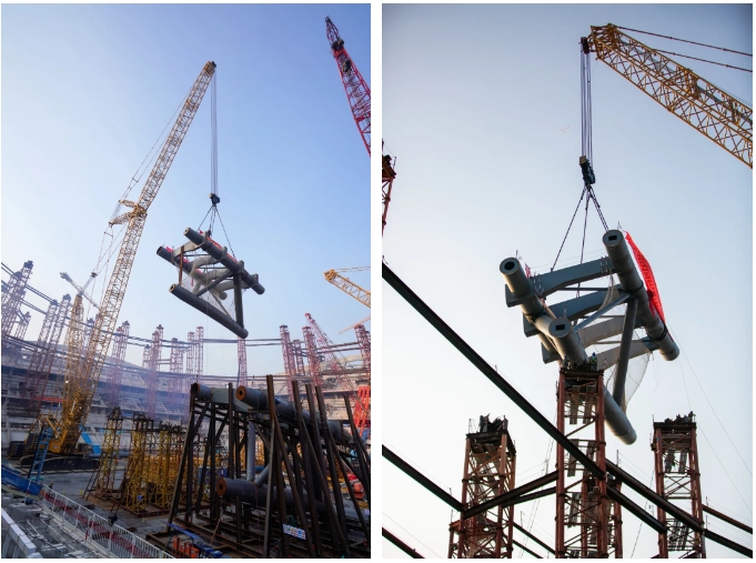 本次實(shí)施的首次吊裝段,位于內(nèi)環(huán)桁架,單元吊重達(dá)168噸,起吊縱深高達(dá)60余米。項(xiàng)目位于濟(jì)南新舊動(dòng)能轉(zhuǎn)換起步區(qū),建筑面積19.73萬(wàn)平方米,建筑高度為60米,是山東省首個(gè)6萬(wàn)座專(zhuān)業(yè)足球場(chǎng),可承辦國(guó)際、國(guó)內(nèi)重大體育賽事。同時(shí)也是國(guó)內(nèi)體育場(chǎng)館懸挑長(zhǎng)度最大的工程,最大懸挑長(zhǎng)度達(dá)到了45米,屋蓋鋼結(jié)構(gòu)由星形拱桁架、內(nèi)環(huán)桁架、外環(huán)桁架、單層網(wǎng)格及挑檐組成,總鋼量約3.1萬(wàn)噸,靠36根排架柱支撐,形成巨型無(wú)柱大懸挑空間,在整體結(jié)構(gòu)中起到了承上啟下作用,下方排架柱與混凝土結(jié)構(gòu)相連,上方支撐索結(jié)構(gòu)、膜結(jié)構(gòu)。項(xiàng)目預(yù)計(jì)在2026年底竣工驗(yàn)收完成。
