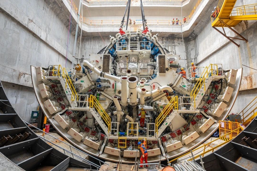 工程所采用的“山河號(hào)”盾構(gòu)機(jī),是世界在建最大直徑泥水平衡盾構(gòu)機(jī),最大開(kāi)挖直徑17.5米,總長(zhǎng)163米、重達(dá)5200噸、裝機(jī)總功率12580千瓦,裝配各類(lèi)刀具306把,其中57把可實(shí)現(xiàn)滾刀齒刀互換,刀盤(pán)開(kāi)口率53%,最大限度滿(mǎn)足掘進(jìn)所面對(duì)的復(fù)雜地層,盾構(gòu)機(jī)總裝達(dá)到世界先進(jìn)水平。