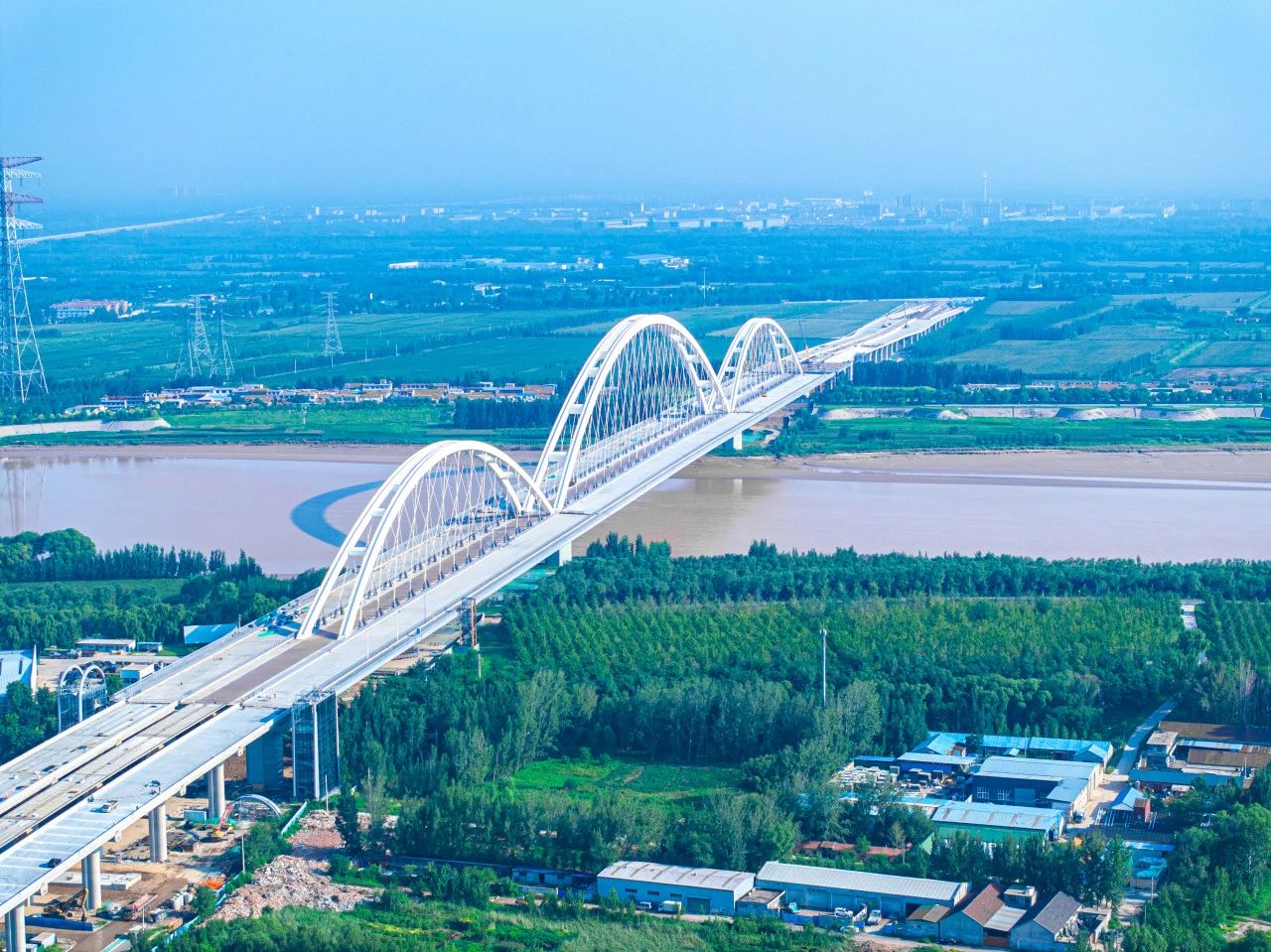 濟(jì)南黃河齊魯大橋為黃河之上首座下承式網(wǎng)狀系桿拱橋,主跨徑達(dá)420米、寬60.7m,創(chuàng)世界同類型橋梁最大跨徑、最大梁寬,其400Mpa超高應(yīng)力幅拉索在橋梁建設(shè)領(lǐng)域首次研發(fā)應(yīng)用。