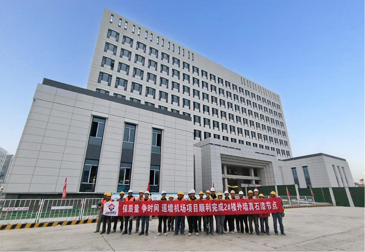 歷經(jīng)50天施工,濟南遙墻機場配套設施項目2#邊檢物業(yè)用房外墻真石漆分項工程順利完工,項目2#邊檢業(yè)務用房含邊檢辦公用房和邊檢備勤用房,建成后將做為濟南遙墻機場邊防檢查業(yè)務的主要辦公用房。本項目外墻真石漆面積13280平方,整體以乳白色為主色調,外窗上下輔以灰色及白色點綴,整體設計莊重大氣,線條簡單分明。