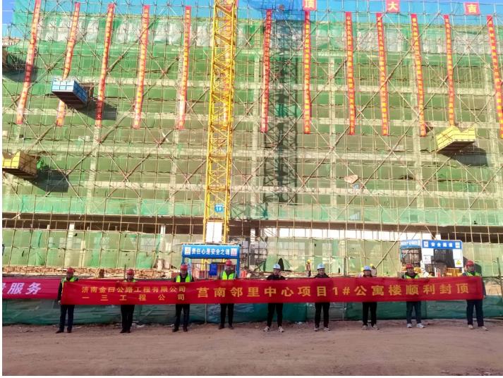 鄰里中心項目是臨沂市觀摩項目,涉及鋼結(jié)構(gòu)、鋼筋混凝土結(jié)構(gòu)、幕墻工程、裝飾裝修、安裝工程、電梯工程、ALC墻板工程等多個專業(yè)性較強的領(lǐng)域,工期緊、任務(wù)重,給項目團隊帶來了很大的挑戰(zhàn)。項目部周密策劃組織施工,積極落實質(zhì)量安全交底,統(tǒng)籌調(diào)配人材機配置與進場,鉚足干勁、團結(jié)協(xié)作,每天召開例會各個擊破現(xiàn)場問題,不斷提高施工效率、質(zhì)量。12月15日,項目公寓樓順利封頂,標(biāo)志著項目建設(shè)取得階段性勝利。