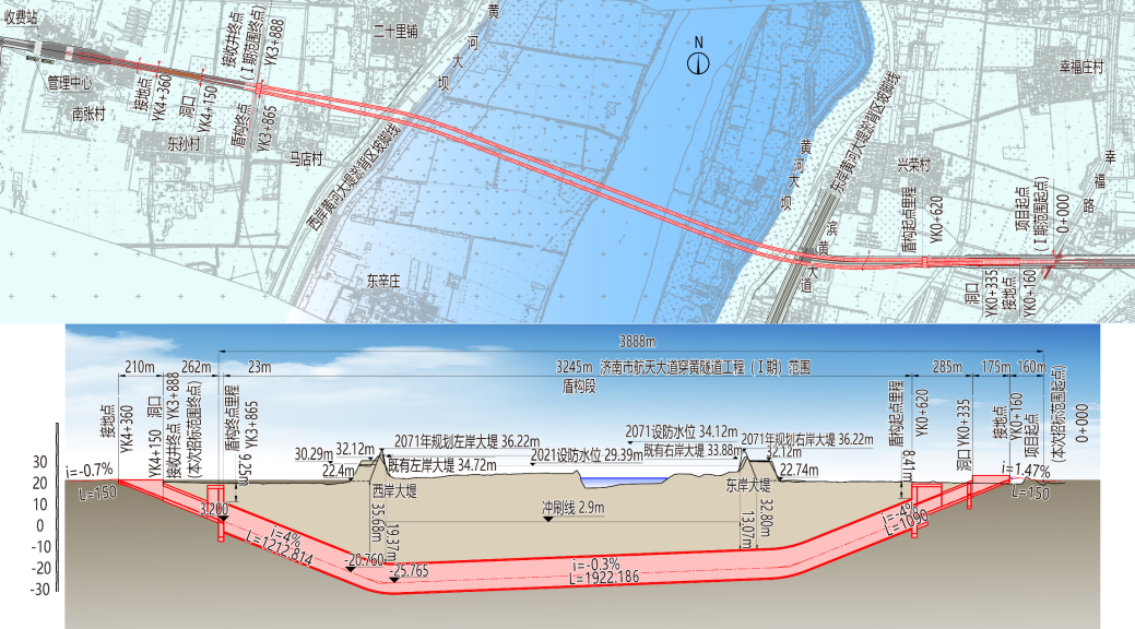 濟(jì)南市航天大道穿黃隧道工程(I期)項(xiàng)目東起高新區(qū)航天大道與X012交叉口,向西下穿黃河后止于西岸起步區(qū)馬店村,全長(zhǎng)3888米,作為串聯(lián)黃河兩岸的骨干線,是山東省、濟(jì)南市重點(diǎn)項(xiàng)目,對(duì)提升省市形象、改善人居出行、搭建城北片區(qū)骨架路網(wǎng)起到重要的支撐帶動(dòng)作用。