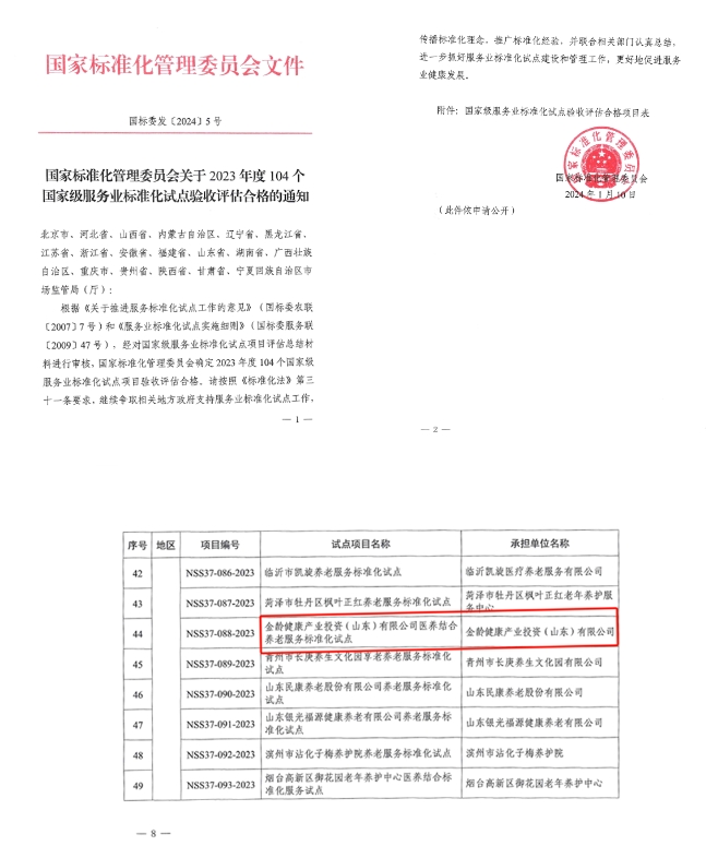 近日,根據(jù)《關(guān)于推進(jìn)服務(wù)標(biāo)準(zhǔn)化試點(diǎn)工作的意見》(國標(biāo)委農(nóng)聯(lián)[2007]7號)和《服務(wù)業(yè)標(biāo)準(zhǔn)化試點(diǎn)實(shí)施細(xì)則》(國標(biāo)委服務(wù)聯(lián)[2009]47號),經(jīng)對國家級服務(wù)業(yè)標(biāo)準(zhǔn)化試點(diǎn)項(xiàng)目評估總結(jié)材料進(jìn)行審核,國家標(biāo)準(zhǔn)化管理委員會確定2023年度104個國家級服務(wù)業(yè)標(biāo)準(zhǔn)化試點(diǎn)項(xiàng)目驗(yàn)收評估合格,建設(shè)集團(tuán)所屬金齡健康產(chǎn)業(yè)投資(山東)有限公司醫(yī)養(yǎng)結(jié)合養(yǎng)老服務(wù)標(biāo)準(zhǔn)化試點(diǎn)通過驗(yàn)收。