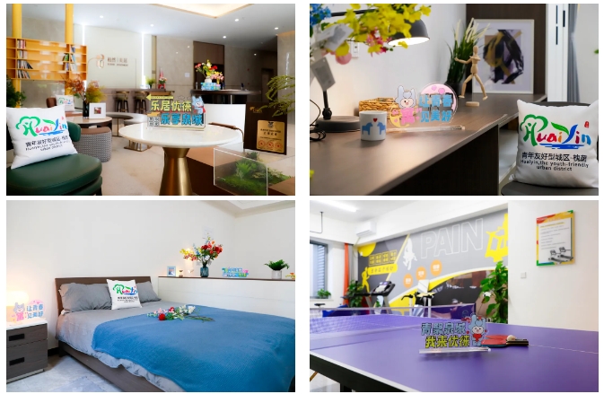 區(qū)別于普通出租公寓、酒店賓館,根據(jù)青年喜好,植入專屬LOGO 、IP形象等青春元素。房間內(nèi)部配備床、衣柜、書(shū)桌椅、置物架等,并有獨(dú)立衛(wèi)浴、冷暖供應(yīng),青年可“拎包入住”。公共區(qū)域整體打造自助辦公、學(xué)習(xí)閱讀、運(yùn)動(dòng)健身、共享會(huì)客、休閑娛樂(lè)、自助廚房6大功能區(qū),滿足青年日常需求。