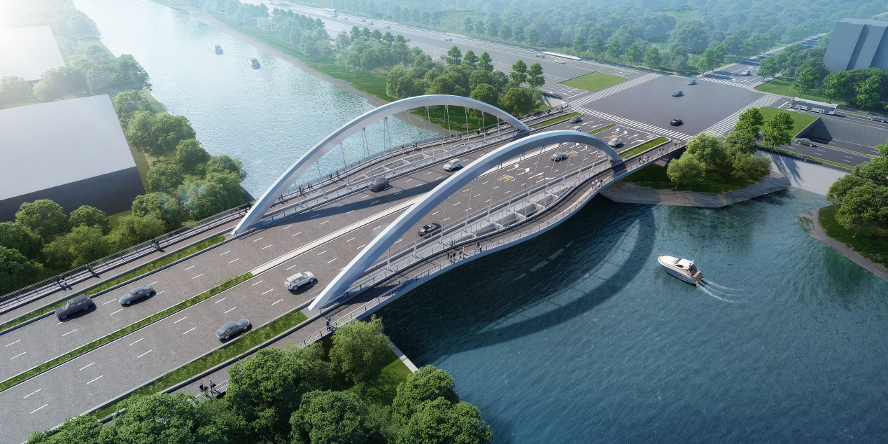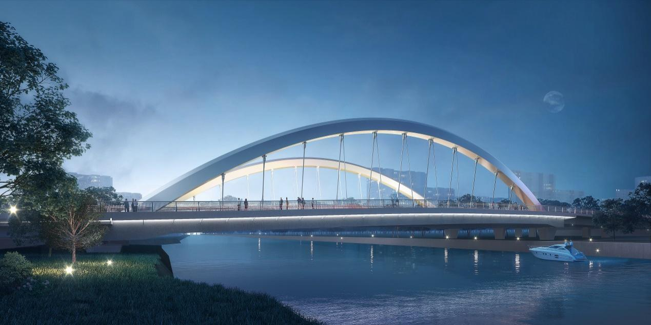該工程是唯亭東部片區(qū)跨婁江通行的重要通道,北起金陵西路、南至蘇虹東路,全長約1.1公里,雙向6車道規(guī)模。跨婁江河新建一座外傾式鋼結構系桿拱橋,主跨90米,全橋共設置11對主吊桿,5對輔吊桿,總用鋼量約2700噸。本次首榀鋼箱梁采用鋼拱鋼梁,總長43米、寬5.9米、高3.3米,重達255噸。