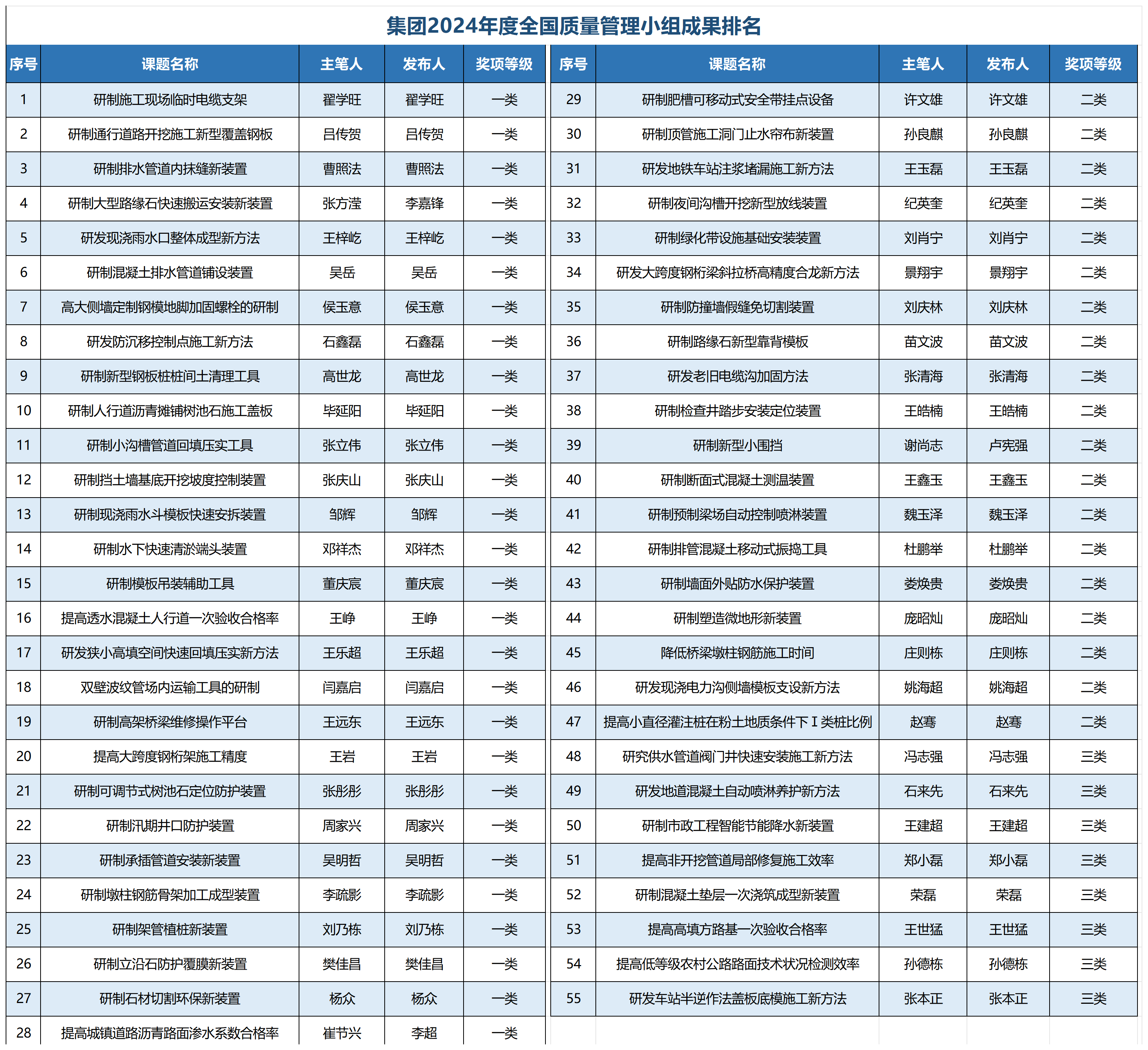在本次市政工程建設質(zhì)量管理活動中,城建集團公司發(fā)布QC成果55項,其中,一類成果28項、二類成果19項、三類成果8項;發(fā)布質(zhì)量信得過班組成果14項,其中,示范級班組8項、專業(yè)級班組5項、推進級班組1項。