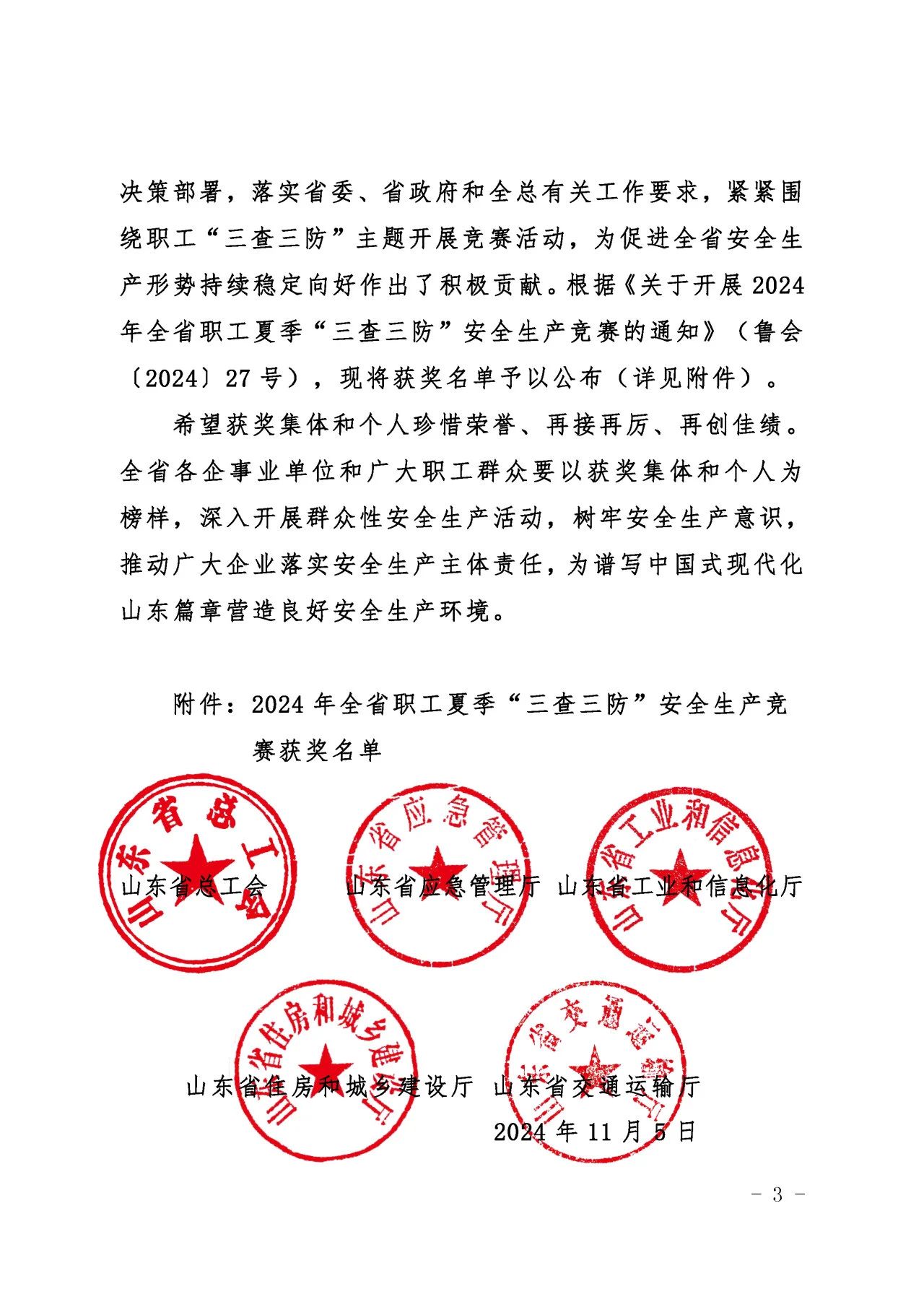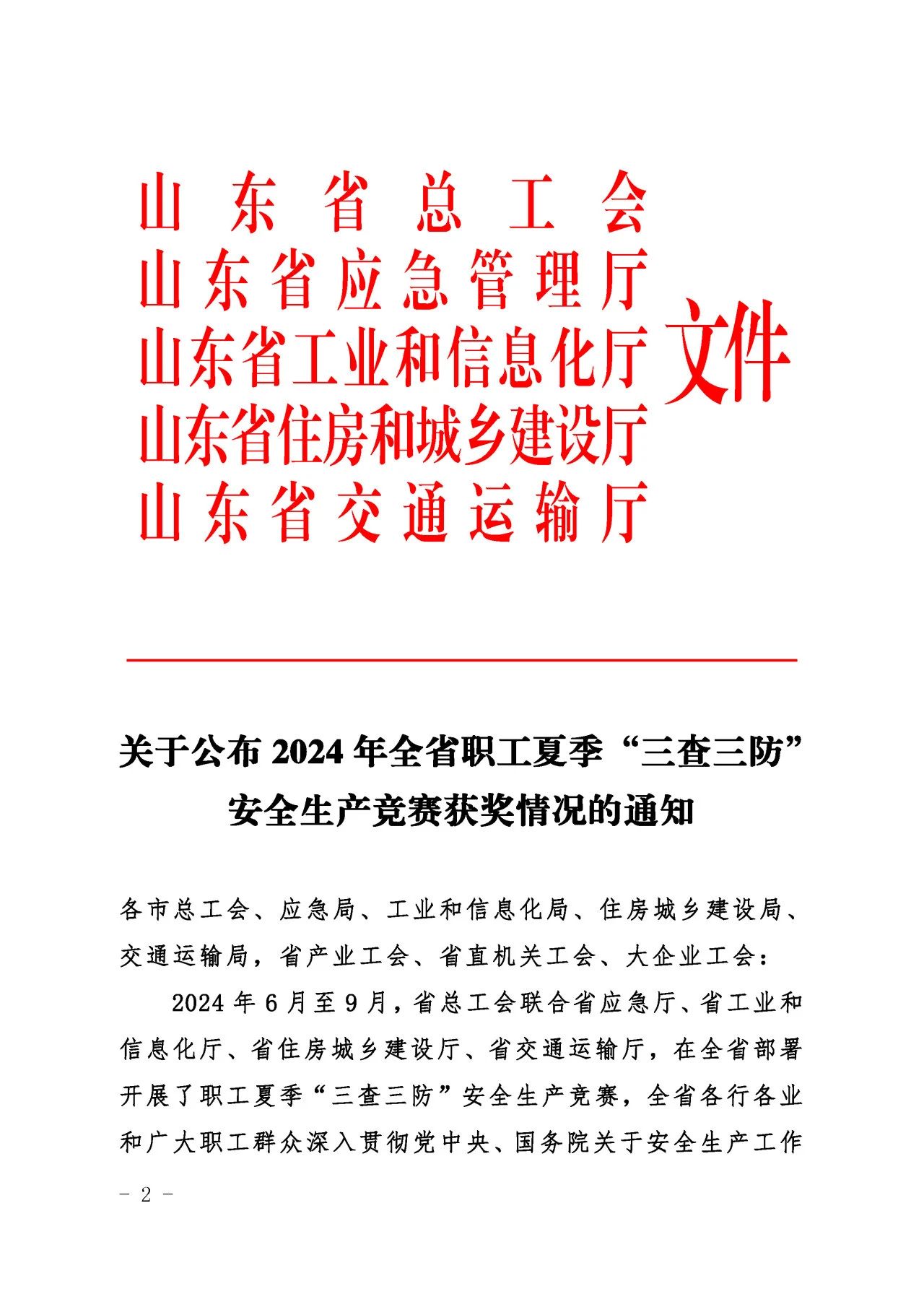 近日,山東省總工會、山東省應(yīng)急管理廳、山東省工業(yè)和信息化廳、山東省住房和城鄉(xiāng)建設(shè)廳、山東省交通運輸廳聯(lián)合發(fā)布了《關(guān)于公布2024年全省職工夏季“三查三防”安全生產(chǎn)競賽獲獎情況的通知》,濟南城市建設(shè)集團質(zhì)量安全部積極響應(yīng)上級主管部門的號召,按照集團黨委的科學(xué)部署,全面而深入地開展了各項安全專題活動,榮獲“三查三防”安全生產(chǎn)競賽優(yōu)勝班組榮譽稱號。