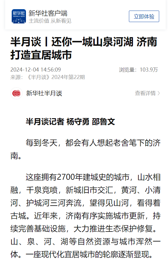 這座擁有2700年建城史的城市,山水相融,千泉競噴,新城舊市交匯,黃河、小清河、護城河三河奔流,望得見山河,看得著古城。近年來,濟南有序?qū)嵤┏鞘懈?,持續(xù)完善基礎(chǔ)設(shè)施,大力推進(jìn)生態(tài)保護修復(fù)。山、泉、河、湖等自然資源與城市渾然一體。一座現(xiàn)代化宜居城市的輪廓逐漸顯現(xiàn)。