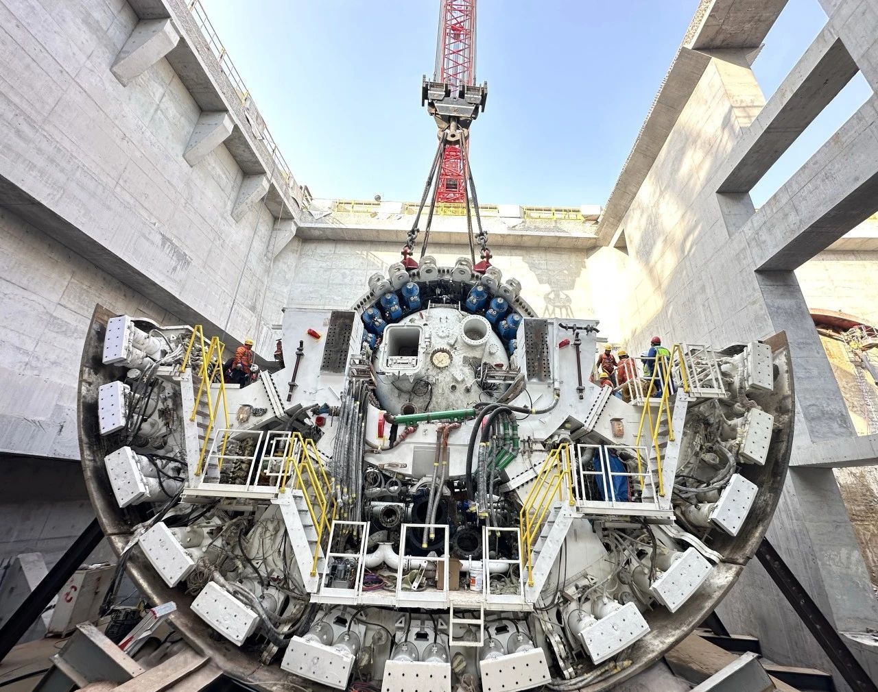 用于濟(jì)南市航天大道穿黃隧道施工的“啟航號(hào)”盾構(gòu)機(jī)長(zhǎng)達(dá)161米,總重量約4295噸,盾構(gòu)機(jī)直徑15.06米。此次吊裝下井的主驅(qū)動(dòng)寬7.6米、重390噸,是整個(gè)盾構(gòu)機(jī)的核心部件,也是整個(gè)盾構(gòu)機(jī)吊裝組裝階段最為關(guān)鍵的一環(huán)。