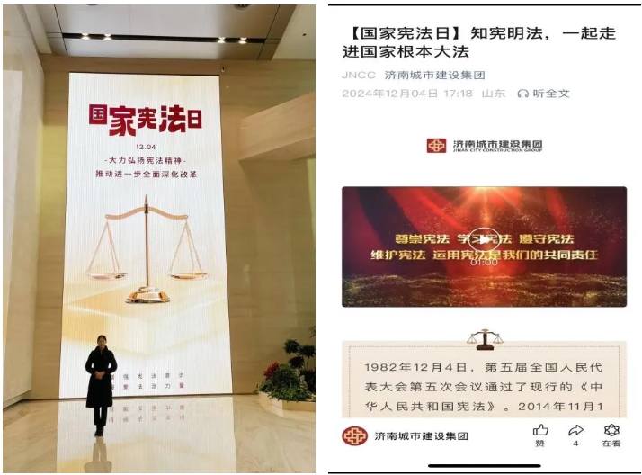 活動(dòng)期間,集團(tuán)在一樓大廳電子屏投放自行設(shè)計(jì)的國(guó)家憲法日宣傳海報(bào),營(yíng)造濃厚活動(dòng)氛圍,并在微信公眾號(hào)開設(shè)“法治宣傳教育”欄目,推送《【國(guó)家憲法日】知憲明法,一起走進(jìn)國(guó)家根本大法》《憲法宣傳周│習(xí)近平法治思想知識(shí)問答(上)》《憲法宣傳周│習(xí)近平法治思想知識(shí)問答(下)》《憲法宣傳周│新《公司法》知識(shí)問答(上)》《憲法宣傳周│新《公司法》知識(shí)問答(下)》共計(jì)5篇普法推文。同時(shí),集團(tuán)廣泛動(dòng)員各子公司靈活采用線上、線下相結(jié)合的普法形式,大力弘揚(yáng)憲法精神,營(yíng)造尊法守法護(hù)法的企業(yè)氛圍,引導(dǎo)廣大干部職工自覺做習(xí)近平法治思想的傳播者、踐行者。