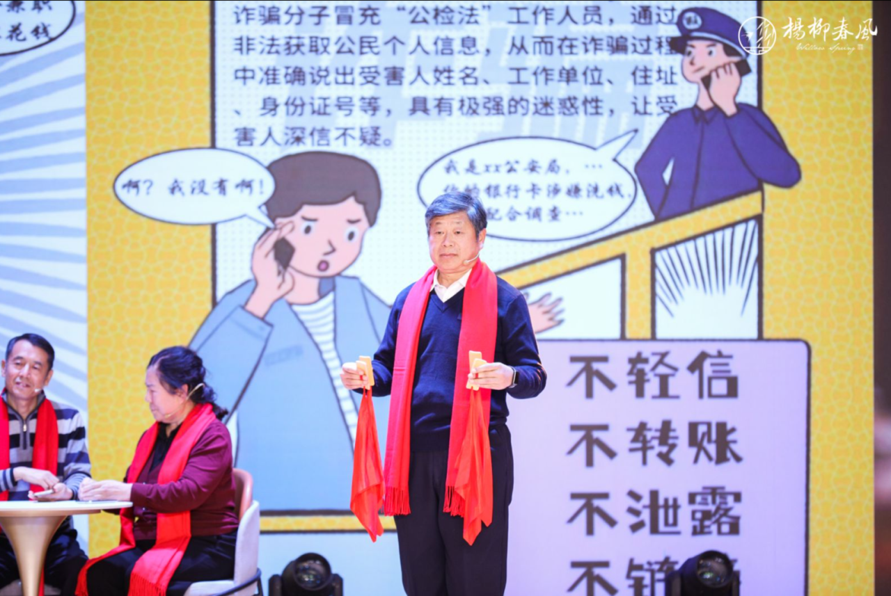 頤樂學院的老師和學員們帶來了《梁?!泛汀陡桧炞鎳罚貌煌臉菲餮葑喑鰰r代的聲音?;笔a區(qū)派出所的離退休老干部將反詐知識融入快板,節(jié)目既幽默有趣又具有警示意義,讓觀眾坐得住、聽得進、記得牢。