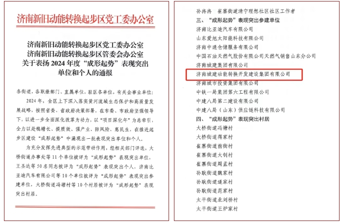 2月6日,濟(jì)南新舊動(dòng)能轉(zhuǎn)換起步區(qū)召開2025年工作動(dòng)員大會(huì),通報(bào)表彰2024年度“成形起勢(shì)”表現(xiàn)突出的單位及個(gè)人。建設(shè)集團(tuán)所屬濟(jì)南城建動(dòng)能轉(zhuǎn)換開發(fā)建設(shè)集團(tuán)有限公司,榮獲2024年度起步區(qū)“成形起勢(shì)”表現(xiàn)突出參建單位。